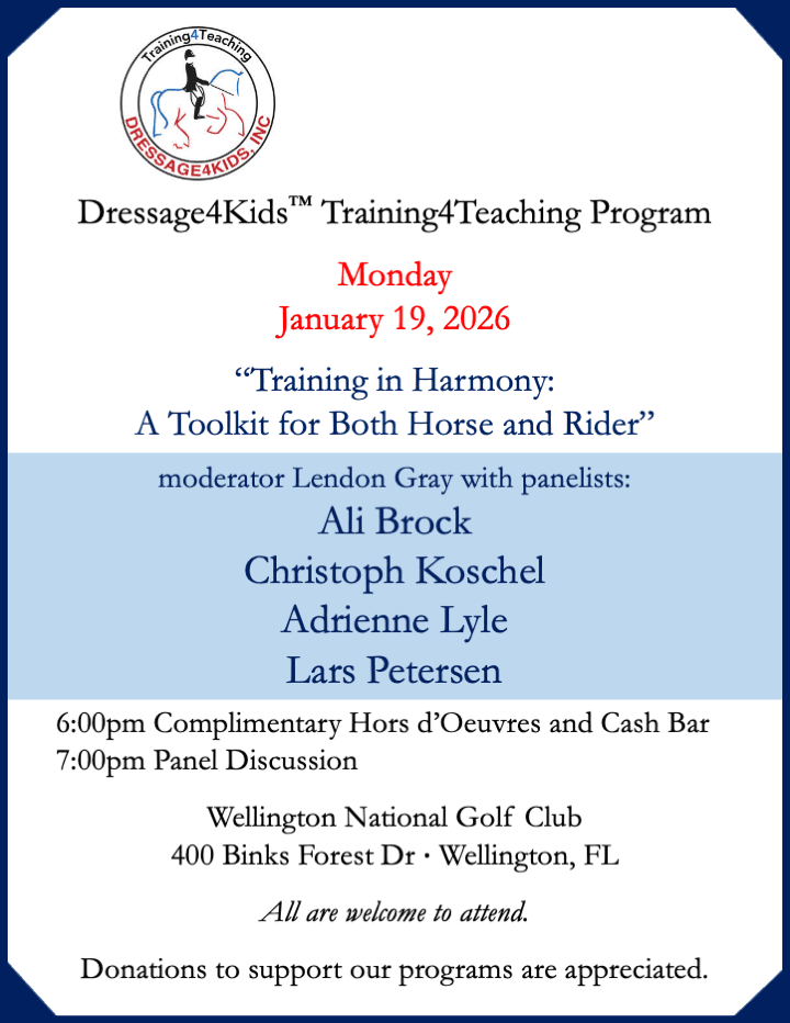 Join Dressage4Kids on Monday, January 19th in Wellington, Florida following the Adequan®/USDF FEI Level Trainers Conference as we welcome panelists as part of the Dressage4Kids Training4Teaching Program! All are welcome to attend.